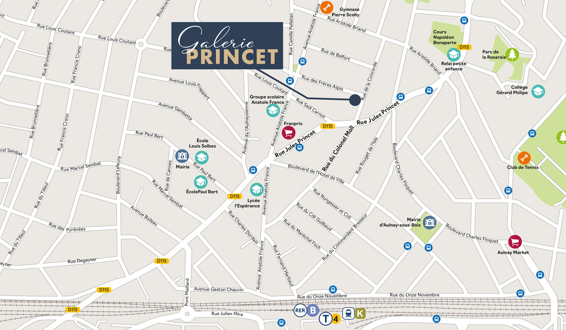 - Gare d’Aulnay-sous-Bois à 11 min à pied : RER B, Transilien K et tramway T4